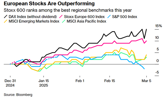 欧洲股市是今年全球表现最好的股市之一,因为投资者押注于经济刺激政策和乌克兰可能实现的停火。在基金纷纷退出价格高昂的美国股市之际,欧洲较低的估值也被证明具有吸引力,暂时盖过了对全球贸易战的担忧。