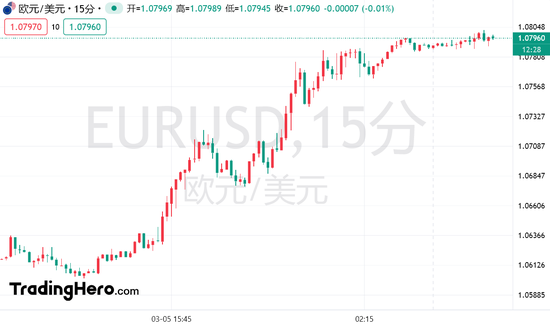 欧元兑美元汇率盘中上涨了1.5%,达到1.078,为11月以来的最高水平。德国基准股指大涨3.4%,创下自2022年以来的最大单日涨幅,并使泛欧斯托克600指数接近历史最高纪录。德国国债的走势也拖累欧元区其他国家的收益率大幅走高。欧洲防务板块延续了强劲的涨势。