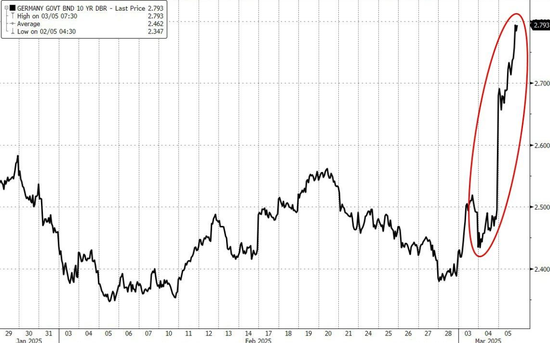 周三德国借贷成本创下数十年来最大涨幅,投资者押注这些历史性协议将为军事和基础设施投资提供资金,从而大幅提振德国萎靡不振的经济。10年期德国国债收益率飙升0.31个百分点,至2.79%,为1990年以来最大单日涨幅,上一次基准债券收益率如此飙升时,冷战即将结束,西德和东德即将统一。