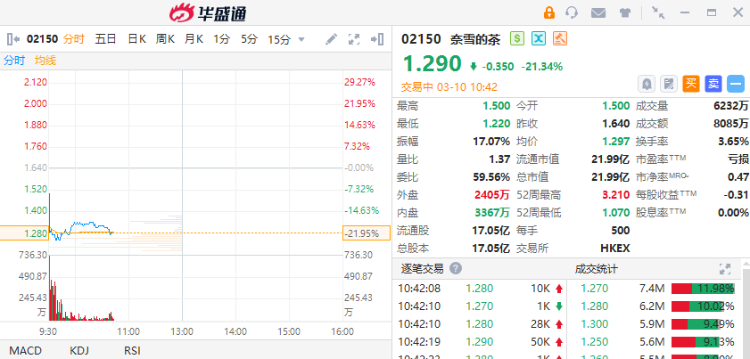 奈雪的茶(02150)3月10日低开约8%,随后继续走低,最低跌约25%,截至发稿跌21.34%,报1.29港元/股。
