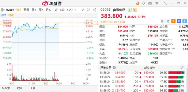 3月10日,蜜雪集团(02097)再涨超8%,盘中高见384.6港元,较招股价已涨近90%。截至发稿,涨8.11%,报383.8港元,成交额4.176亿港元,总市值约1447亿港元。