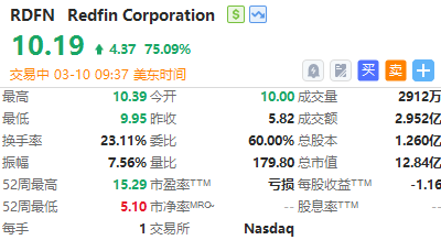 华盛资讯3月10日消息,美国房地产领域两大巨头联手,Rocket豪掷17.5亿美元鲸吞Redfin,截至发稿,在收购相关的利好消息刺激之下,房地产经纪商Redfin $RDFN 股价大涨超75%。