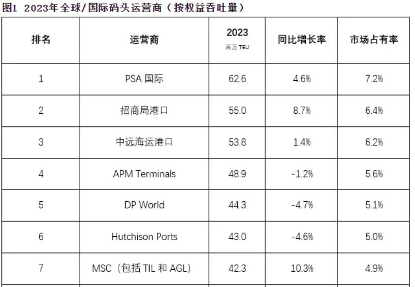 其中,新加坡的PSAInternational位列第一,招商港口(CMPort)、中远海运港口(CoscoShippingPorts)分列第二和第三,李嘉诚的和记港口集团(HutchisonPorts)排名第六,地中海航运公司(MSC)排名第七。