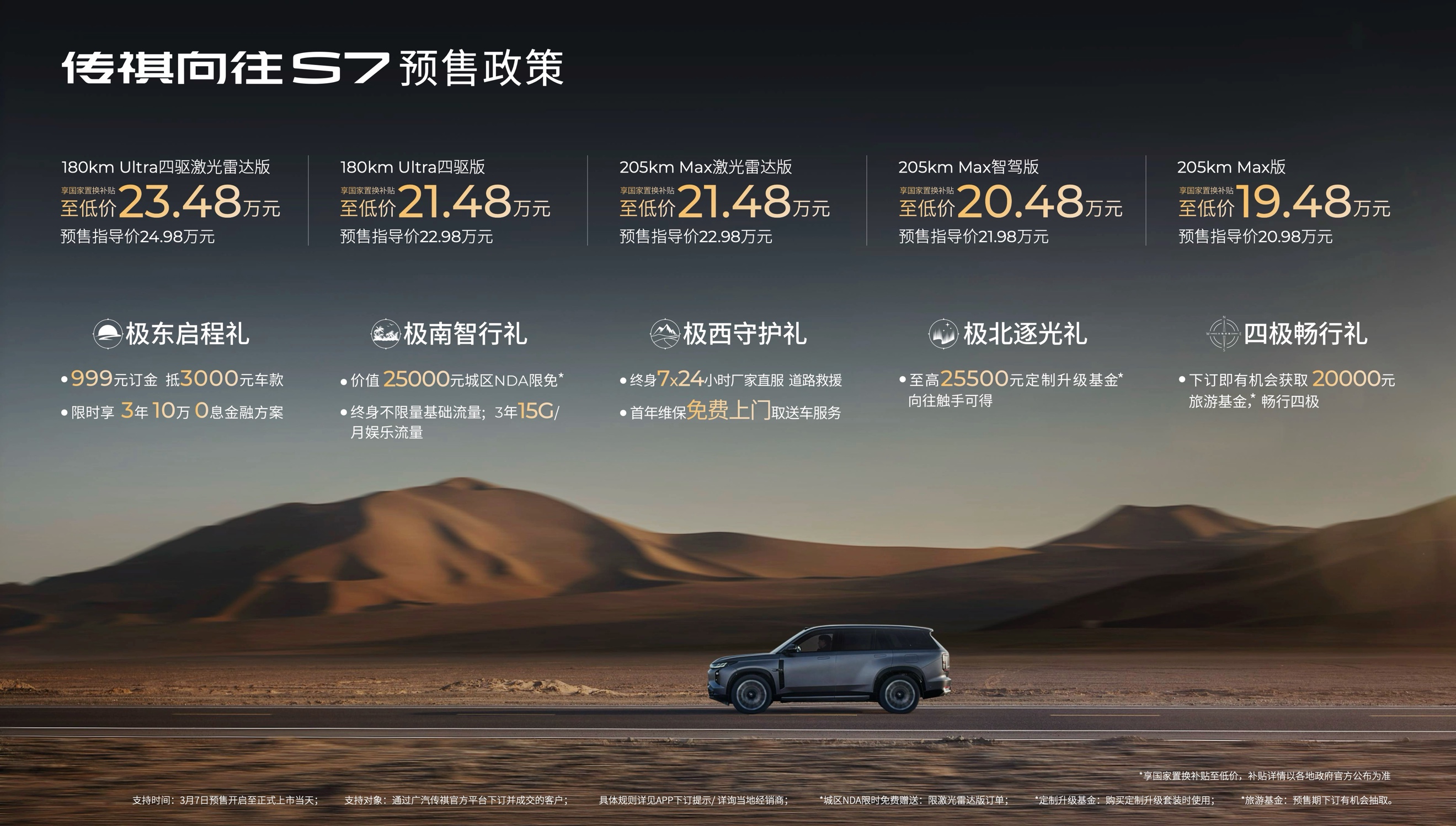 本次发布会上,传祺向往车系带来三款高阶车型,包括“精英家庭中大型智能SUV”传祺向往S7、“智行奢享MPV”传祺向往M8以及“跨时代智能旗舰”1 Concept量产车,都将在2025年内正式上市。作为传祺向往车系高阶智能第一车,传祺向往S7正式开启预售,涵盖两大系列共五大车型版本,价格区间为20.98万至24.98万元。享受国家补贴后,价格低至19.48万至23.48万元。