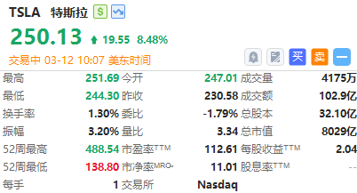 华盛资讯3月12日消息,特斯拉 $TSLA 盘初大涨超8%,报250.13美元。消息面上,马斯克在其个人社交平台X上表示:“为了表达对特朗普总统政策的强力支持,并展现我们对美国未来的信心,特斯拉承诺在未来两年内将美国的汽车产能翻倍!”