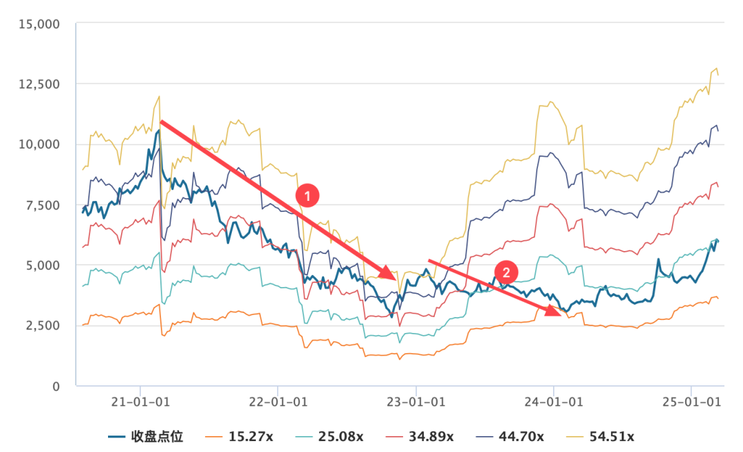 恒生科技始于 2021 年的熊市,严格来说要分为两段。第一段❶是 2021 年初到 2022 年末,一方面可以看到PE-Bands大幅下挫,意味着的确当时中概股的利润在迅速滑坡,另一方面实际线的位置也从最高的模拟线回落至平均线区域。