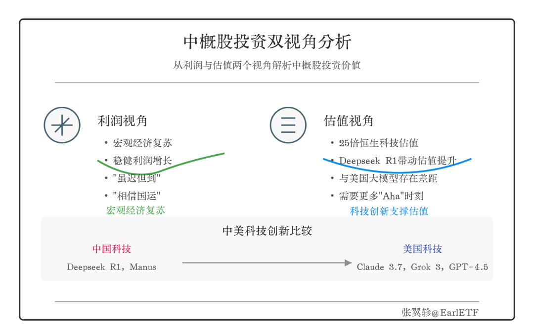 第二,是估值视角。25 倍的恒生科技,不算贵,但显然也不算便宜。估值的提升,很大程度上取决于“星辰大海”。2025 年初的这波估值提升,毫无疑问所有的投资者都要感谢 Deepseek R1,或许近期还要感谢Manus。但同步也能看到,美国的大模型,无论是 Claude 3.7 Sonnet 的编码能力,还是 Grok 3 的超量算卡支撑,抑或 GPT-4.5 人性化的文笔,的确有技术和规模上的优势。Deepseek R1 很好,但还不够。这块的估值支撑,需要更多中国科技企业的“Aha”时刻,包括大模型,包括机器人,包括智能汽车。