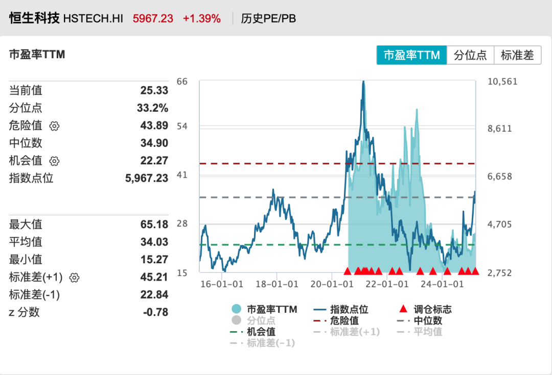 从PE-Bands角度来看,近期恒生科技指数虽然点位超过了去年“9·24”行情,但是从PE-Bands的位置来看,其实是低于的。从下面放大的图表可以看到,去年“9·24”的时候,是远高于绿色Band(25.08x),但是当下不过刚刚到。