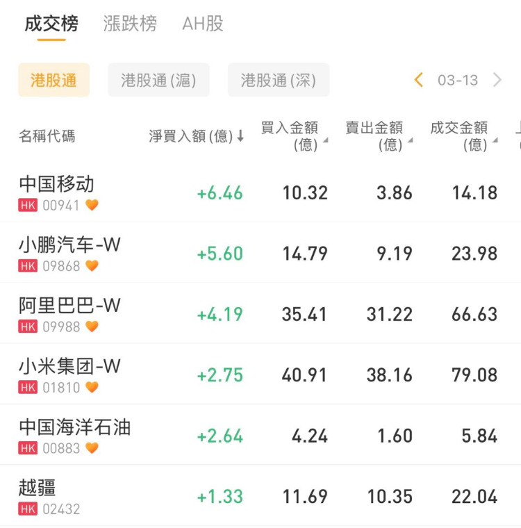 中国移动、小鹏汽车-W、阿里巴巴-W分别获净买入6.46亿港元、5.60亿港元、4.19亿港元;