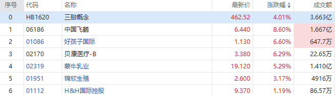 3月14日,婴童概念股早盘高开,截至发稿,中国飞鹤涨近9%,好孩子国际涨超6%,蒙牛乳业涨超5%,锦欣生殖涨超3%。