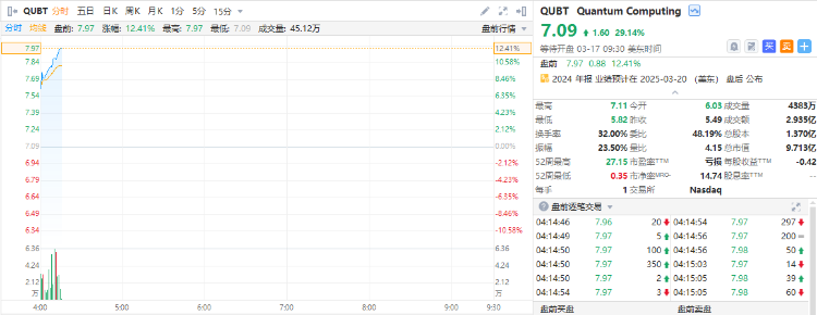 美股量子计算概念盘前多数上扬, $QUBT 涨逾12%, $LAES 涨逾7%, $ARQQ 、 $QBTS 涨逾6%, $IONQ 涨逾4%。