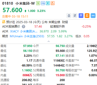 二级市场上,近期小米集团港股创出新高,有所回落后重拾升势,今日该股再度走强,截至发稿,报57.6元,涨超3%,股价接近历史新高。