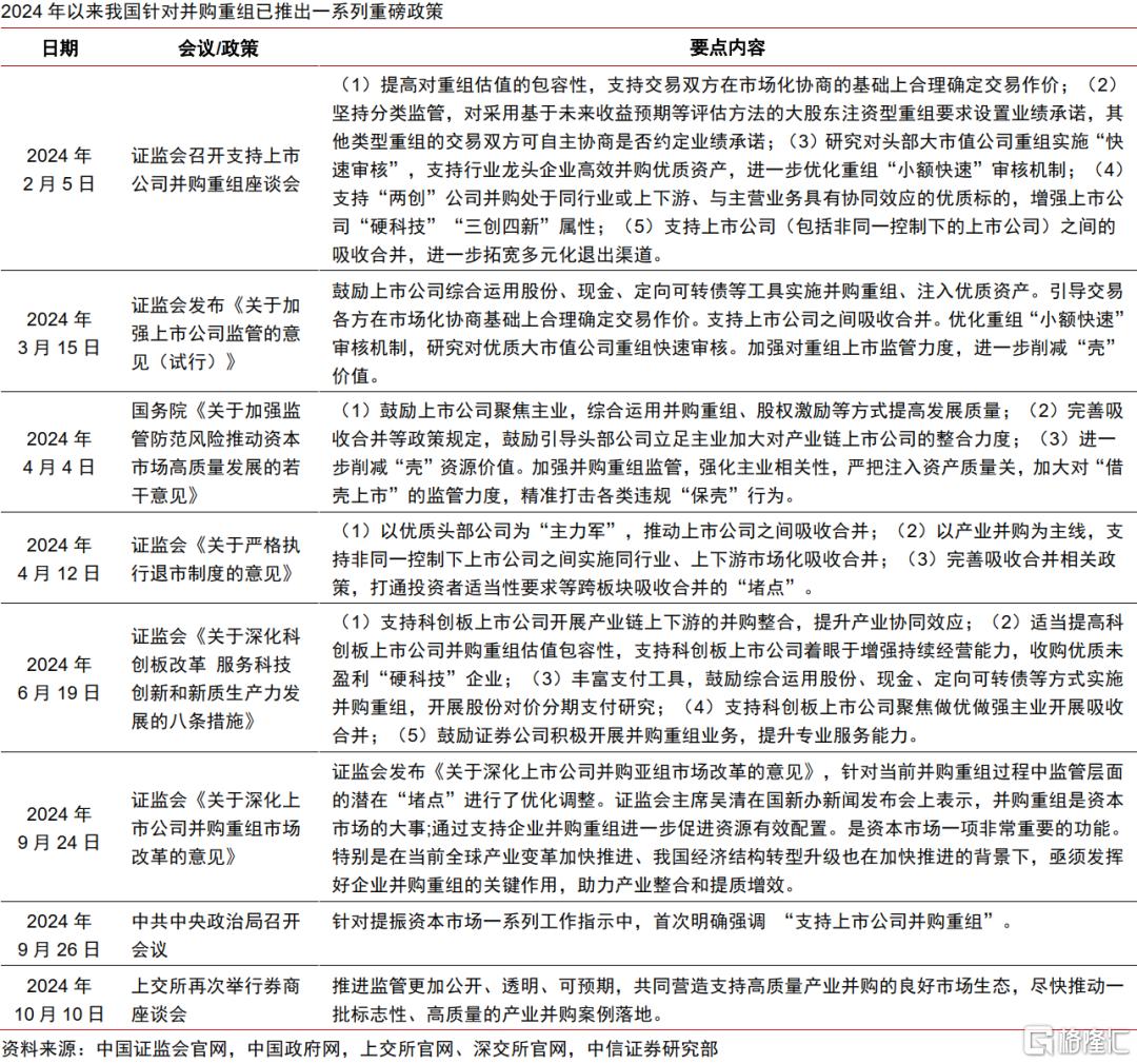 2024年以来,我国并购重组政策持续加码,各级政府纷纷加大支持力度,推动资本市场高质量发展。政策积极鼓励+产业高质量发展背景下,并购重组是满足当下政府、一级市场与二级市场利益的“最大公约数”。央国企凭借资源整合和资金优势积极参与并购重组,推动科技创新和产业升级。