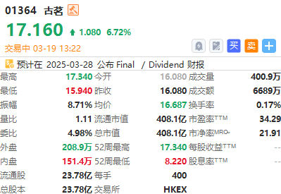 古茗(01364)涨超6%,高见17.34港元创上市新高,总市值突破400亿港元大关。