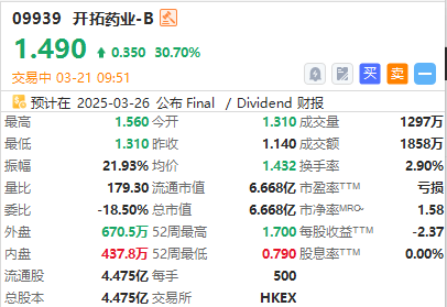 开拓药业-B(09939)大涨超30%,截至发稿,报1.49港元,成交额1858港元。
