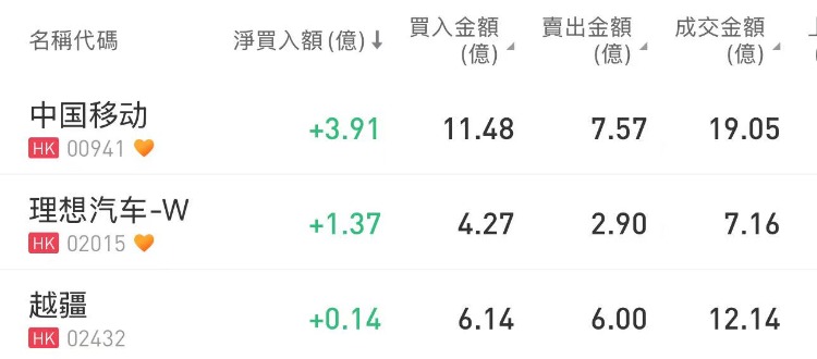 中国移动 (00941.HK)、理想汽车-W (02015.HK)、越疆 (02432.HK)分别获净买入3.91亿港元、1.37亿港元、1421万港元;