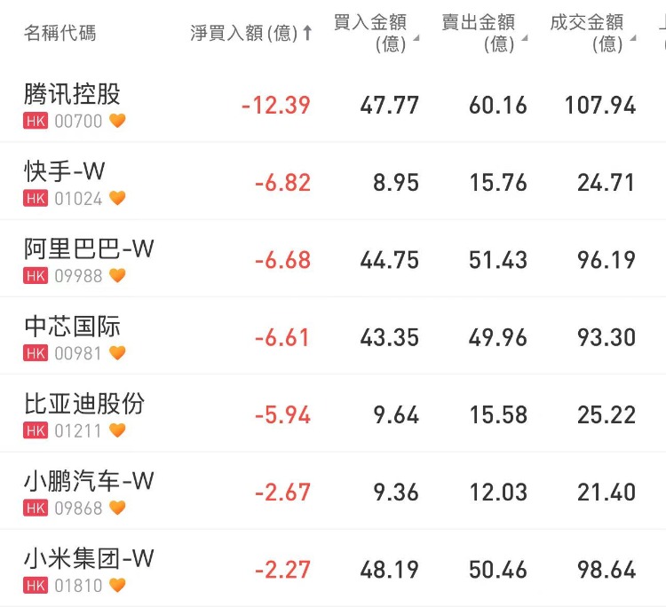 腾讯控股 (00700.HK)、快手-W (01024.HK)、阿里巴巴-W (09988.HK)分别遭净卖出12.39亿港元、6.82亿港元、6.68亿港元。
