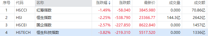 截止收盘,恒科指跌3.82%,国指跌2.65%,恒指跌超2.35%。