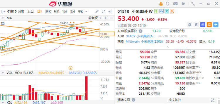 今天,小米收跌超6%报53.4港元,目前总市值1.34万亿港元,较昨日收盘市值蒸发近900亿港元。