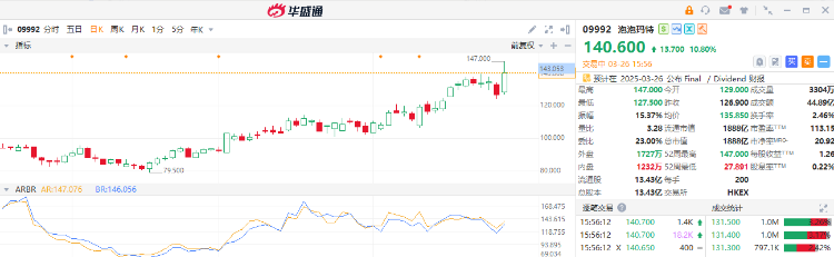 3月26日消息,泡泡玛特尾盘直线拉升一度涨超15%,现涨10.8%。