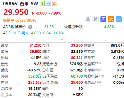 3月28日消息,蔚来早盘遭遇显著下跌,股价下挫逾7%,成交额已达2.61亿港元。公司昨日宣布,通过“闪电”配售方式成功募集约40.3亿港元资金,交易以每股29.46港元的价格完成。