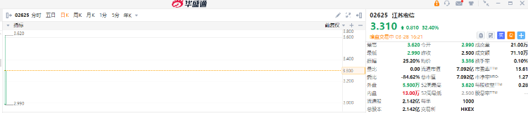 华盛资讯03月28日讯,港股江苏宏信正在暗盘交易中,一度涨38.00%,报3.62港元/股,中签一手赚950.0港元。该股预计将于3月31日正式挂牌上市,配售结果将于今日晚间披露。