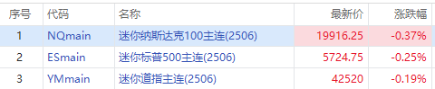 美股三大股指期货周五盘前走低,标普500主连 $ESmain 跌0.25%,道指主连 $YMmain 跌0.19%,纳指主连 $NQmain 跌0.37%。