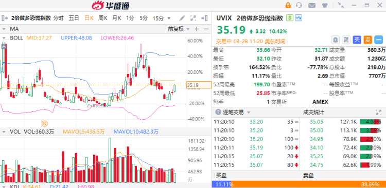 华盛资讯3月28日消息,美股三大指数跌幅扩大,纳指现跌超2%;恐慌指数飙升,2倍做多恐慌指数ETF$UVIX 涨超10%。