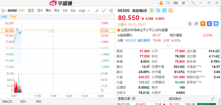 3月31日,美的集团(00300)绩后涨超5%,截至发稿,涨5.5%,报80.55港元,成交额4.114亿港元。