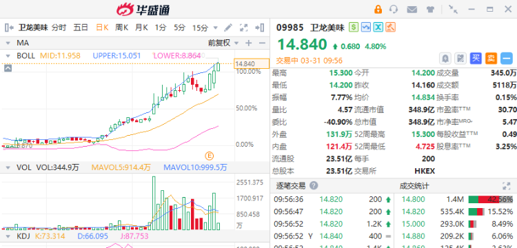 3月31日讯,港股卫龙美味(09985)早盘涨超7%,高见15.3港元续刷上市新高,年初至今股价实现翻倍。截至发稿,涨4.94%,报14.86港元,成交额3461.91万港元。