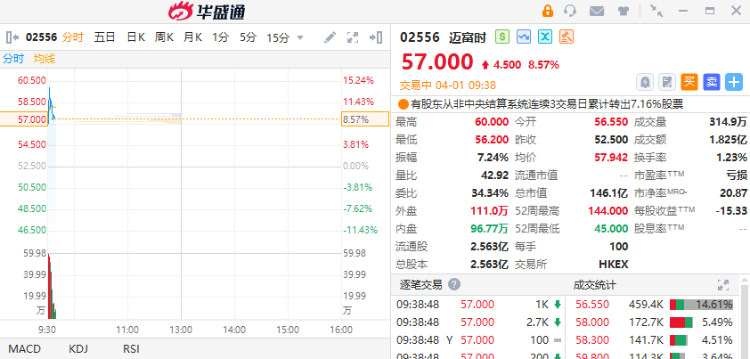 4月1日,迈富时(02556)绩后高开,截至发稿,涨8.57%,报57港元,成交额1.825亿港元。