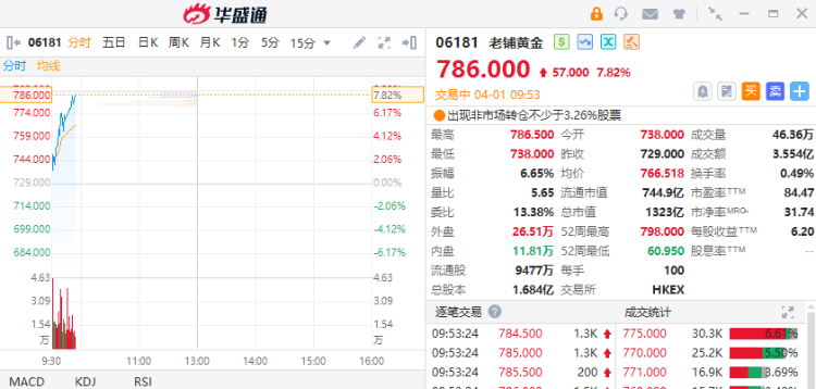 4月1日,老铺黄金(06181)绩后走强,截至发稿,涨7.82%,报786港元,成交额3.554亿港元。
