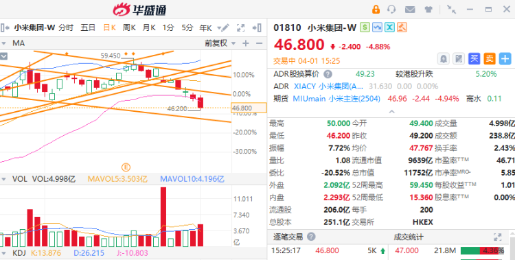 4月1日,小米集团-W午后持续跳水,日内跌幅一度扩大至5%,成交额超230亿港元。截至发稿,每股报46.80港元,跌幅接近5%。