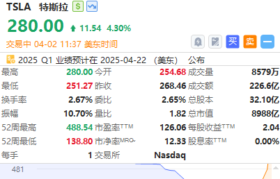 截至发稿,特斯拉涨幅扩大超4%,股价重返280美元,此前一度跌6%。