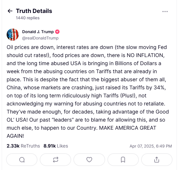 周一,在关税阴影持续施压全球市场之际,特朗普在“真相社交”(Truth Social)上发文称:“油价在下跌,利率在下降(行动迟缓的美联储应该降息!),食品价格也在下跌,不存在通胀。通过已实施的关税,长期受他国压榨的美国每周能从那些压榨我们的国家获得数十亿美元收入。”