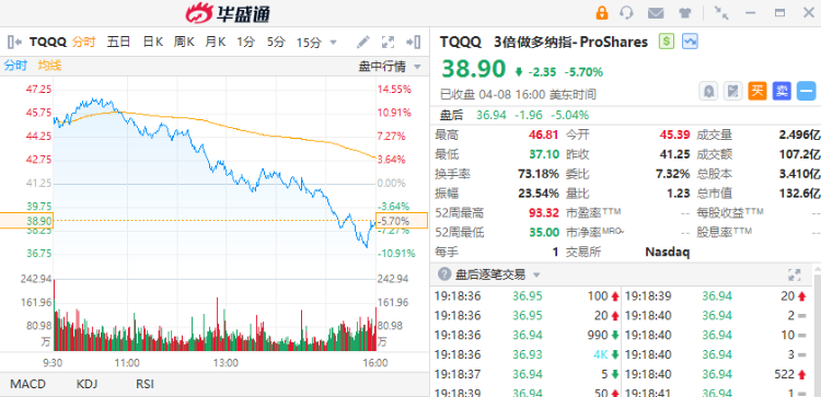 周二(4月8日)早盘时,纳斯达克100指数一度涨超4.4%,TQQQ则一度涨近13.5%。但美股盘中突然扭转涨势一路走低,截至收盘,纳斯达克100指数跌1.95%,TQQQ跌5.7%。
