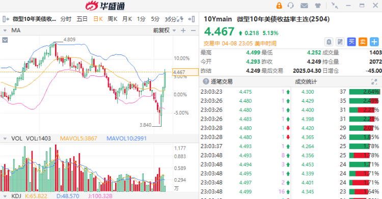 此后抛售一直持续到了周二,10年期美国国债收益率再度飙涨近6%,进一步升至了4.47%——自4月4日的低点算起,已累计上涨了60个基点。鉴于标普500指数连续第四个交易日下跌——“避险”仍是全球市场的主导情绪,这一变化可谓非常引人注目。
