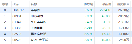 4月10日讯,港股半导体板块早盘领涨大市,截至发稿,上海复旦、黑芝麻智能涨超6%,中芯国际、华虹半导体涨超5%。