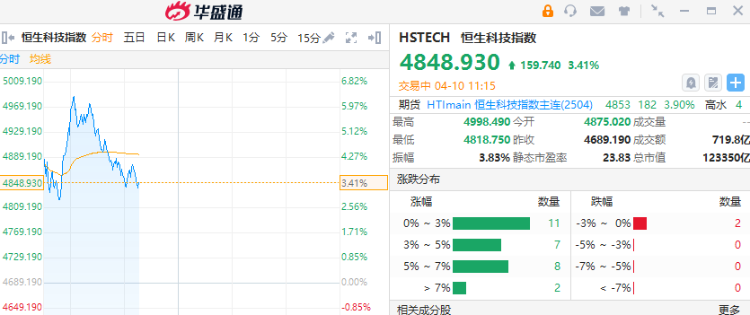 4月10日早盘,港股三大指数集体高开,恒生指数涨3.42%,报20953.12点,恒生科技指数涨4.35%。开盘后,恒生科技指数涨幅持续扩大,一度涨超6%。