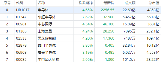 4月11日讯,港股半导体板块走势强劲,华虹半导体涨7%,上海复旦、黑芝麻智能、中芯国际涨超4%。