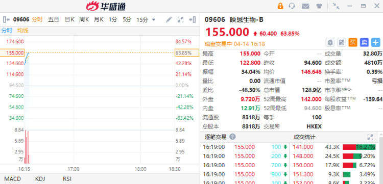 华盛资讯04月14日讯,港股映恩生物-B正在暗盘交易中,截至发稿涨63.85%,报155港元/股,中签一手赚超6000港元,最新总市值超128亿港元。该股预计将于4月15日正式挂牌上市,配售结果将于今日晚间披露。