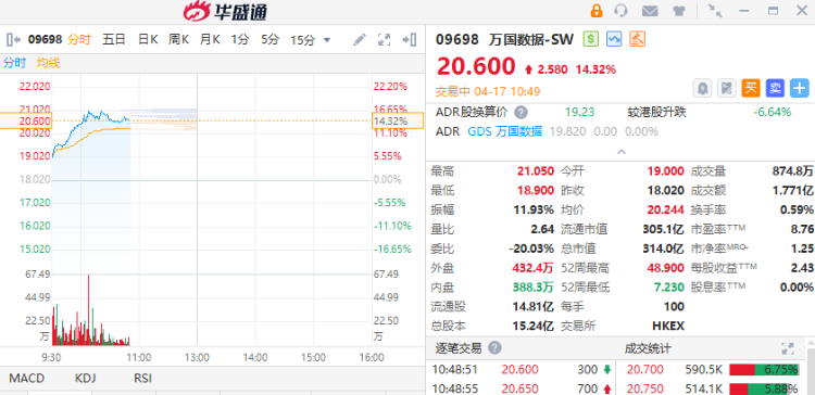 4月17日,万国数据-SW(09698)早盘走强,截至发稿,涨14.32%,报20.6港元,成交额1.771亿港元。