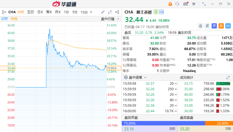 “新茶饮美股第一股” 霸王茶姬于周四正式上市,首日一度飙升超48%后回落,最终收涨15.86%,报32.44美元,总市值约59.5亿美元。招股书显示,公司为中国规模最大、增长最快、最受欢迎的高端现制茶饮品牌。