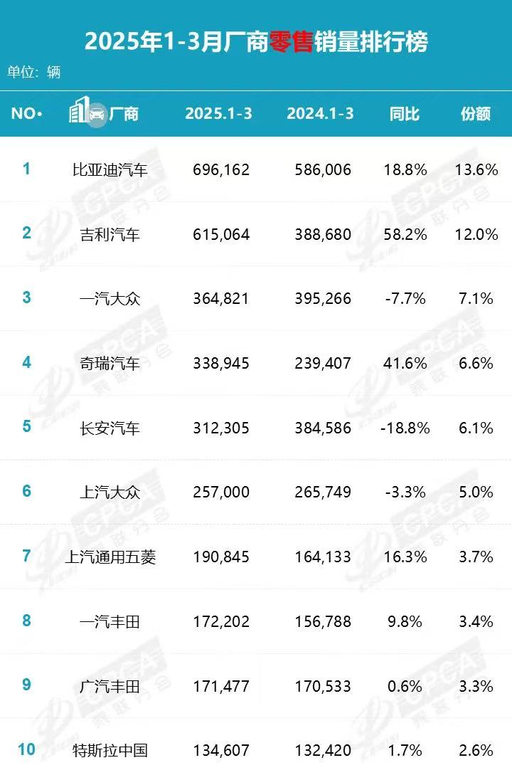 具体来看,今年1-3月厂商零售销量排行榜前五中,仅有一汽大众一家合资品牌跻身其中。排名第一、第二的比亚迪、吉利汽车第一季度销量也咬得很紧,销量分别为69.6万辆、61.5万辆,二者合计占超25%的市场份额。