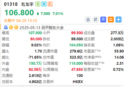 毛戈平涨7%,机构指去年业绩表现亮眼,彩妆与护肤双轮驱动。