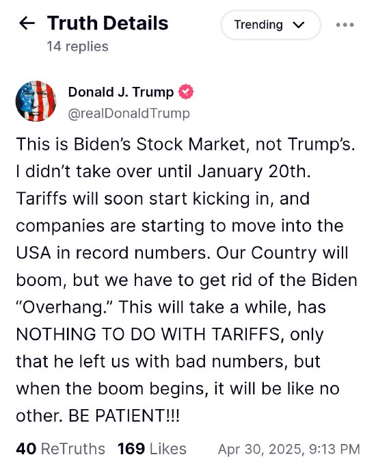 特朗普周三迅速回应了美国经济三年来首次收缩的消息,该消息导致股指下跌。“这是拜登的股市……我们必须摆脱拜登的‘遗留阴影’。”他在社交媒体上发文称,并用全大写强调“与关税无关”,同时呼吁“保持耐心!!!”