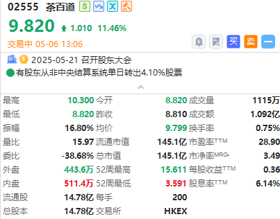 截至发稿,饮料股中,安德利果汁(01364.HK)涨18%、茶百道(02555.HK)涨11%、蜜雪集团(02097.HK)涨2.2%、古茗(01364.HK)涨1.36%。