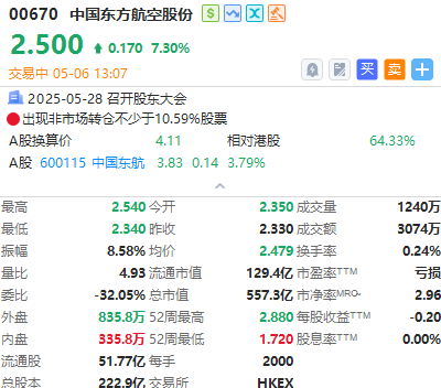 航空股中,中国东方航空、中国南方航空涨超7%、中国国航(00753.HK)涨6%。