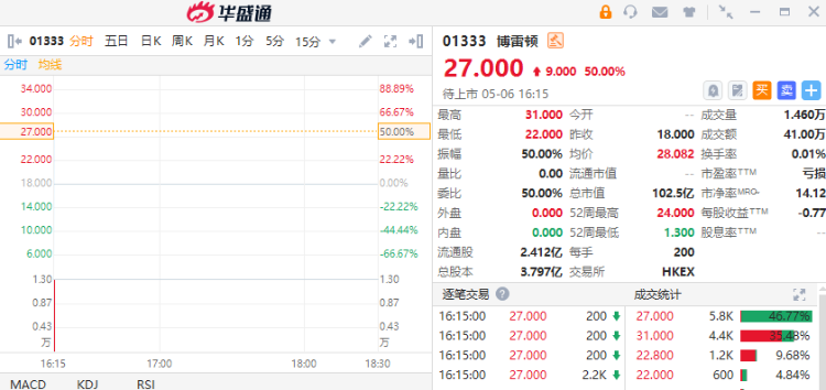 华盛资讯05月06日讯,港股博雷顿正在暗盘交易中,截至发稿涨50%,报27港元/股,中签一手赚1800港元,最新总市值超102亿港元。该股预计将于5月7日正式挂牌上市,配售结果将于今日晚间披露。