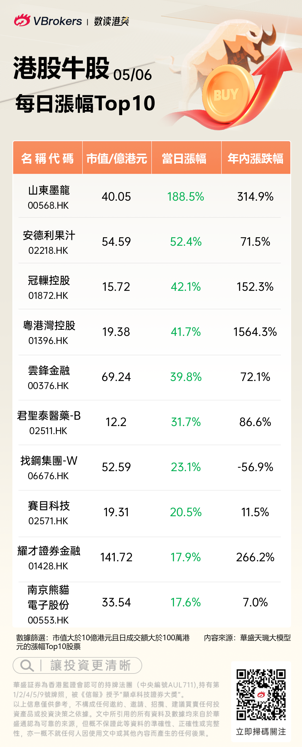 發仔统计了每日港股涨幅Top10,具体名单如下: